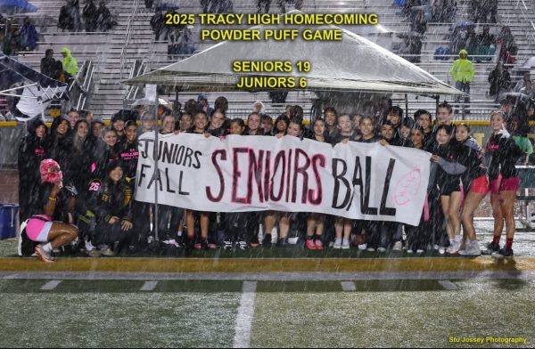 On Monday, October 13th Tracy High hosted their annual powderpuff game to kick off the start of homecoming week. The junior and senior girls faced off in an intense game of flag football during stormy conditions while being cheered on by onlookers in the stands and a group of male cheerleaders. This game ended with the senior girls taking home the victory; winning by 19-6.
